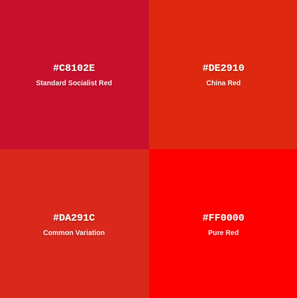 “The most historically accurate would probably be #C8102E,” said Claude, “which captures that classic bright red of Soviet banners and traditional socialist imagery—vibrant but not quite as intense as pure digital red.” DE minus DA in the red channel is 4, and 1C minus 10 in the blue channel is C (obviously), so the difference between China Red and Common Variation is pretty slight, a little less red and a little more blue, comparing the latter to the former. Standard Socialist Red compared to China Red is less red by 16, less green by 19, and more blue by 1E, and is surprisingly cool.2