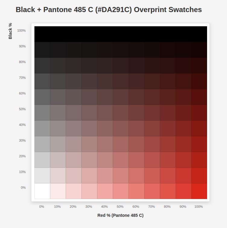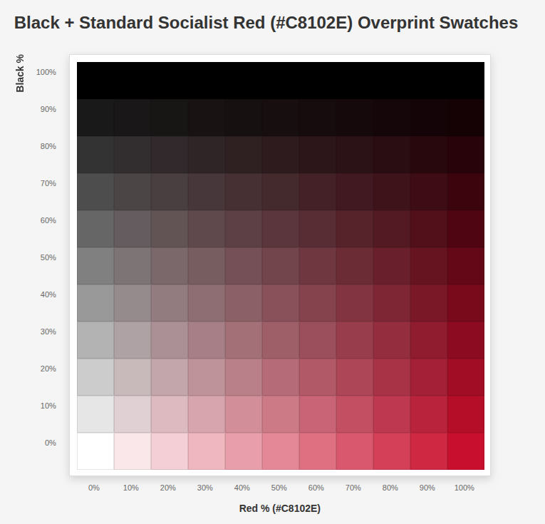 Tony Janello, one of my teachers at RISD, pointed out that when you mix white and blue, you get light blue, but when you mix white and red, you get pink, and pink is not light red. It’s an entirely different color. And 60% black + 50% red, even with Commie Common Variation Red above, is effectively purple. So this is a pretty big palette, considering the constraints.