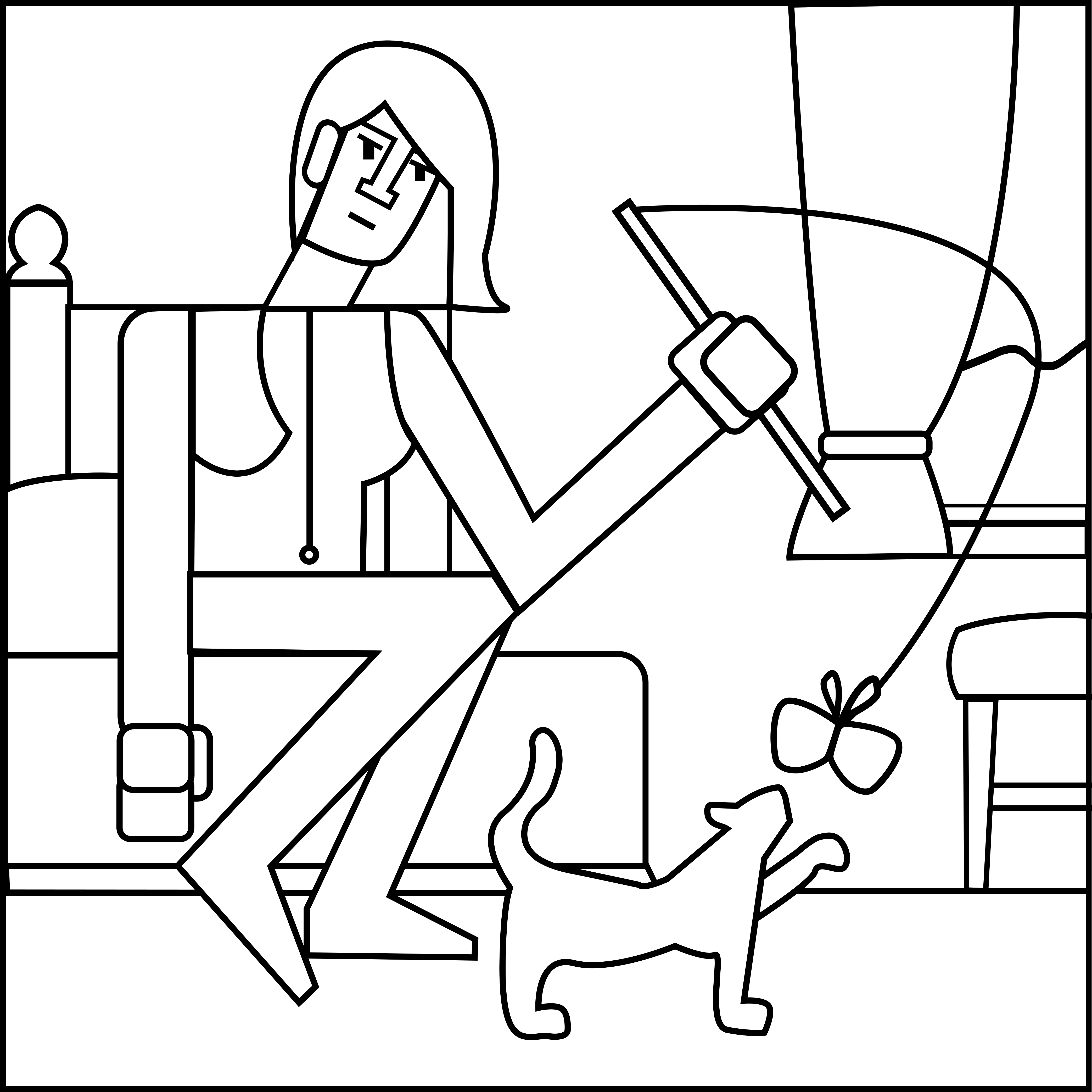 I’m weirdly fascinated with Scalable Vector Graphics, and my current work lends itself to SVG interpretation. I’ve been meaning to make SVG studies a regular part of my image development, and used this drawing as the opportunity. I dropped the scan of the drawing into the bottom layer of an Inkscape document and built wireframes for the shapes. My attempt to draw a square was embarrassing, so I enlarged the window and moved the stool rightwards. (Click and control-drag at a 45-degree angle to the top of the screen with the Rectangle tool will constrain the result to a square.)
