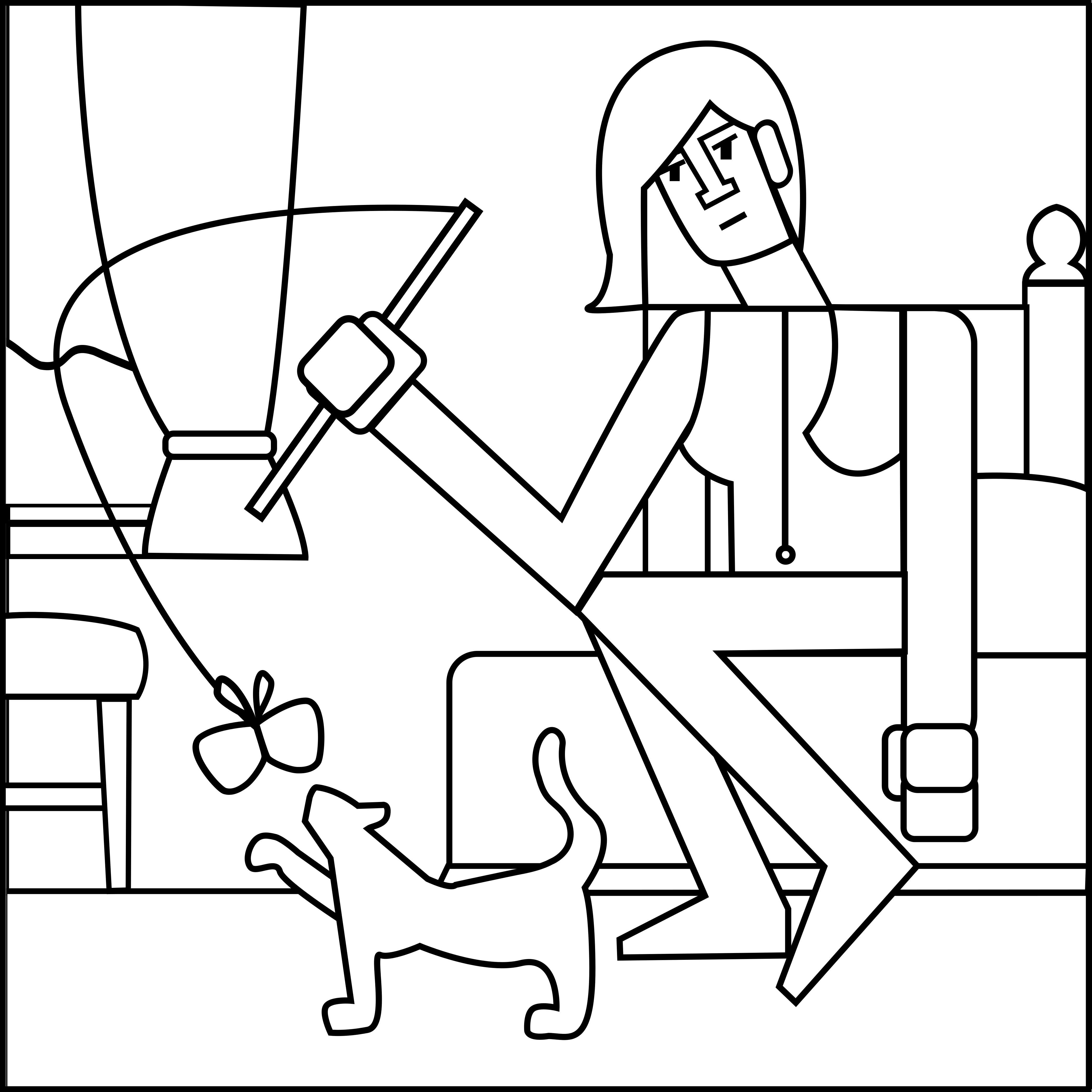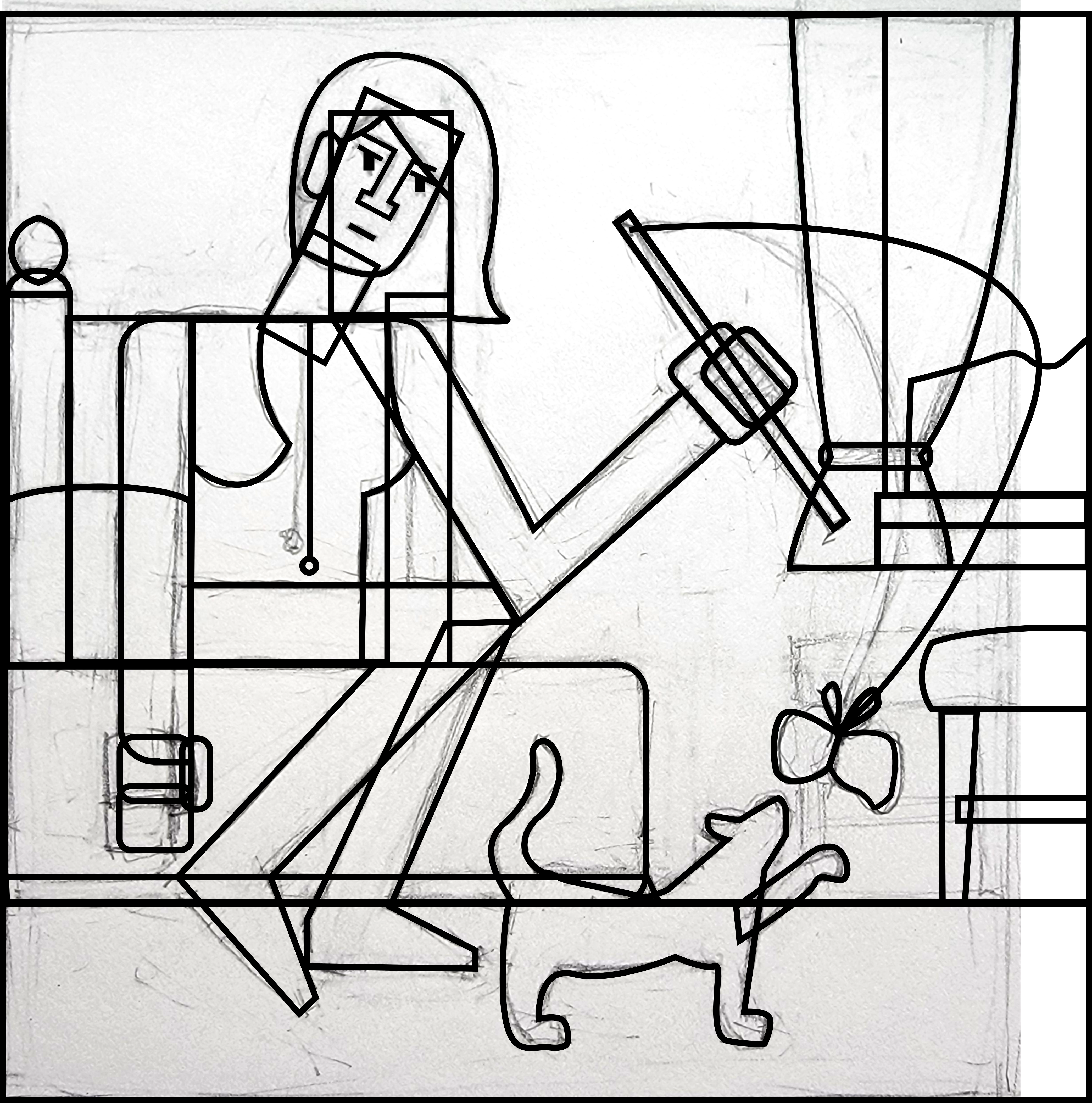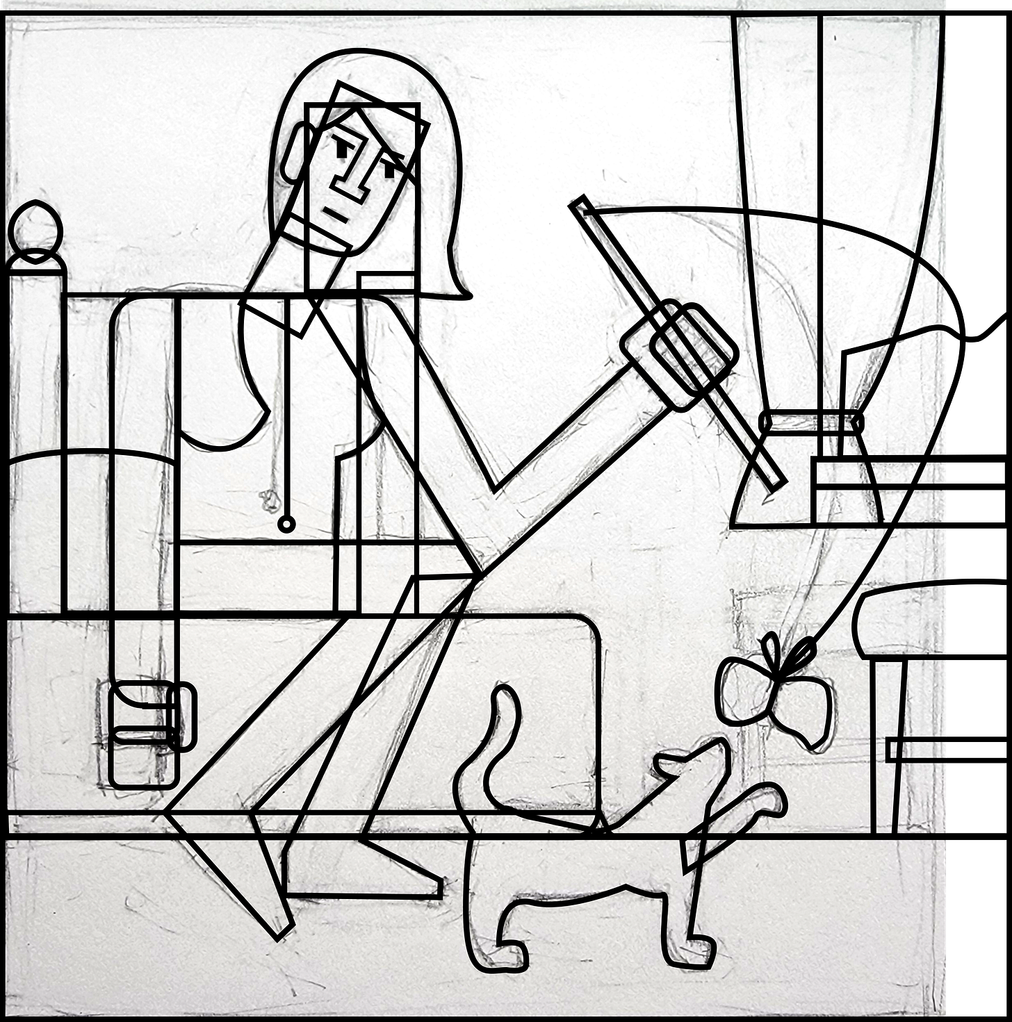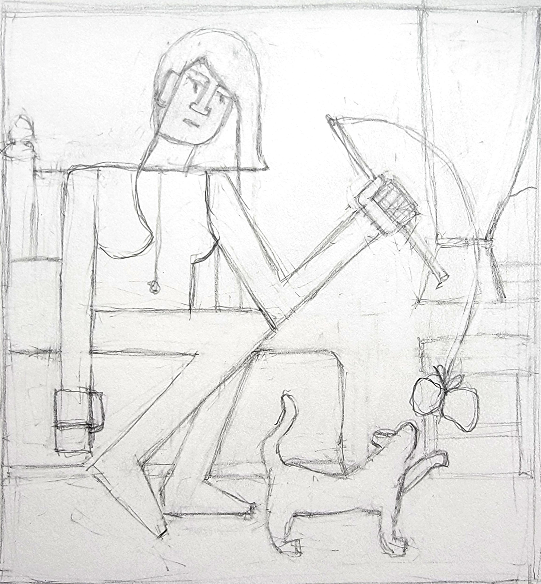 I have a couple of 24 x 24 canvases that I want to use because I have them. Squares are hard to compose, which is why they’ve been sitting around for a bit. I had an idea to do a Balthus homage, and this was the drawing. Nude? Check. Cat? Check. Interior scene? Check.