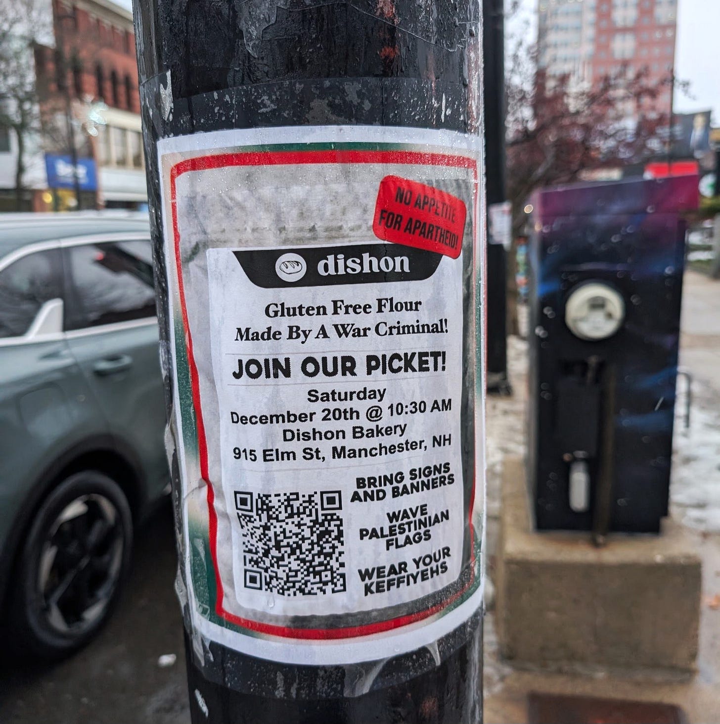 They hung flyers around Manchester accusing a local baker of war crimes. The basis of this charge is that he served in the Israeli Defense Forces sometime between the emergence of Teabonics and that of whitesplaining. Since IDF service and subsequent reservist status are mandatory for most Israelis, this characterization would criminalize millions of Israelis1 and impugn any Jew who wants the state of Israel to continue to exist, which is most of them. This is how the racists at the DSA get around having to proclaim their Judenhass expressly.