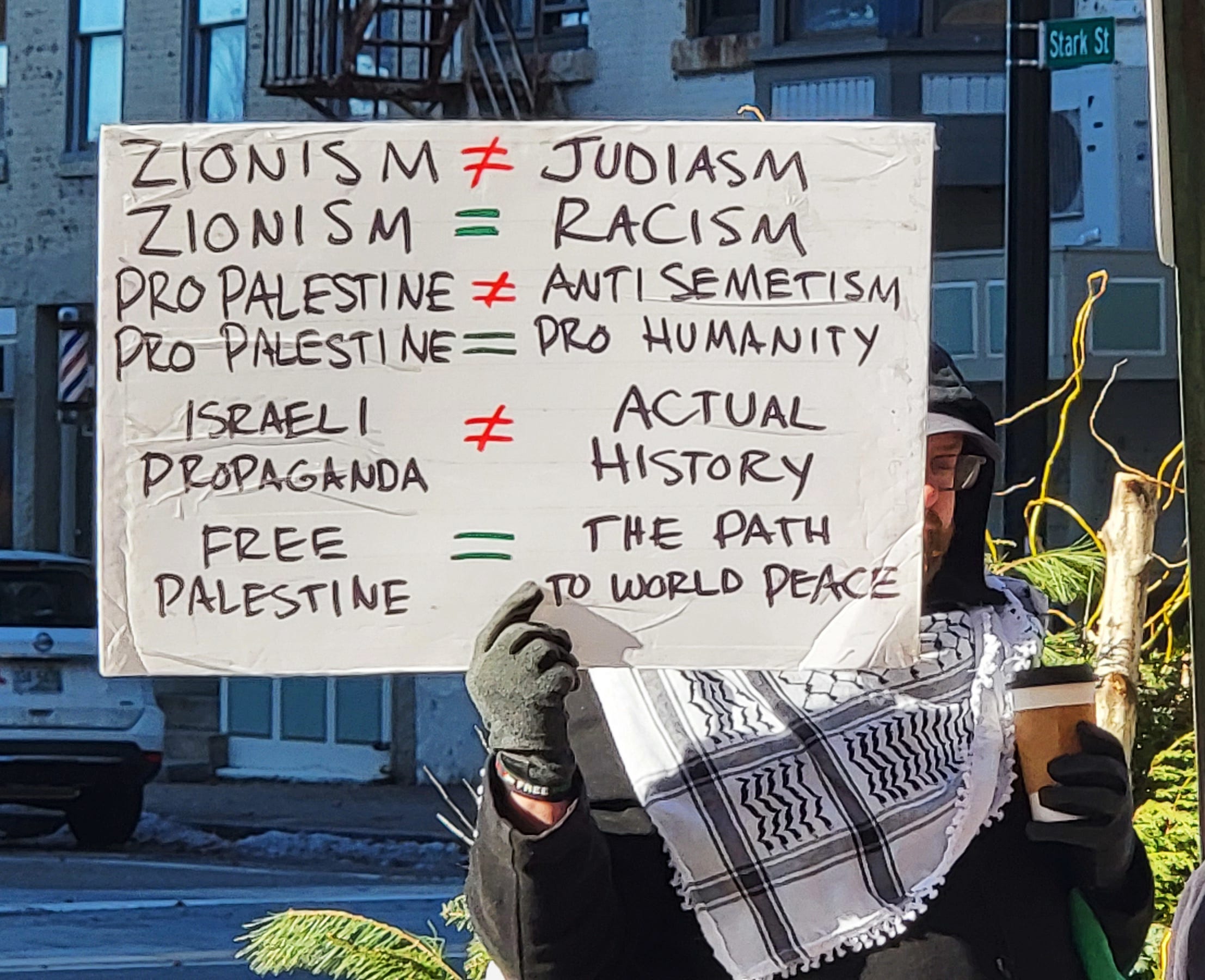 But like so much of the vacuous grift that is contemporary “anti-racism,” it doesn’t apply to the Jews. Non-Jewish progressives can lecture Jews all day long about the Jewish experience of anti-Jewish prejudice, and even the meaning of Judaism itself. I took this photo on Saturday, outside a bakery in downtown Manchester, New Hampshire. It pictures a white protester holding a sign making several bold claims about Zionism, Judaism, Israel, and “Palestine.” We know that the protester isn’t Jewish because he cannot spell Judaism.